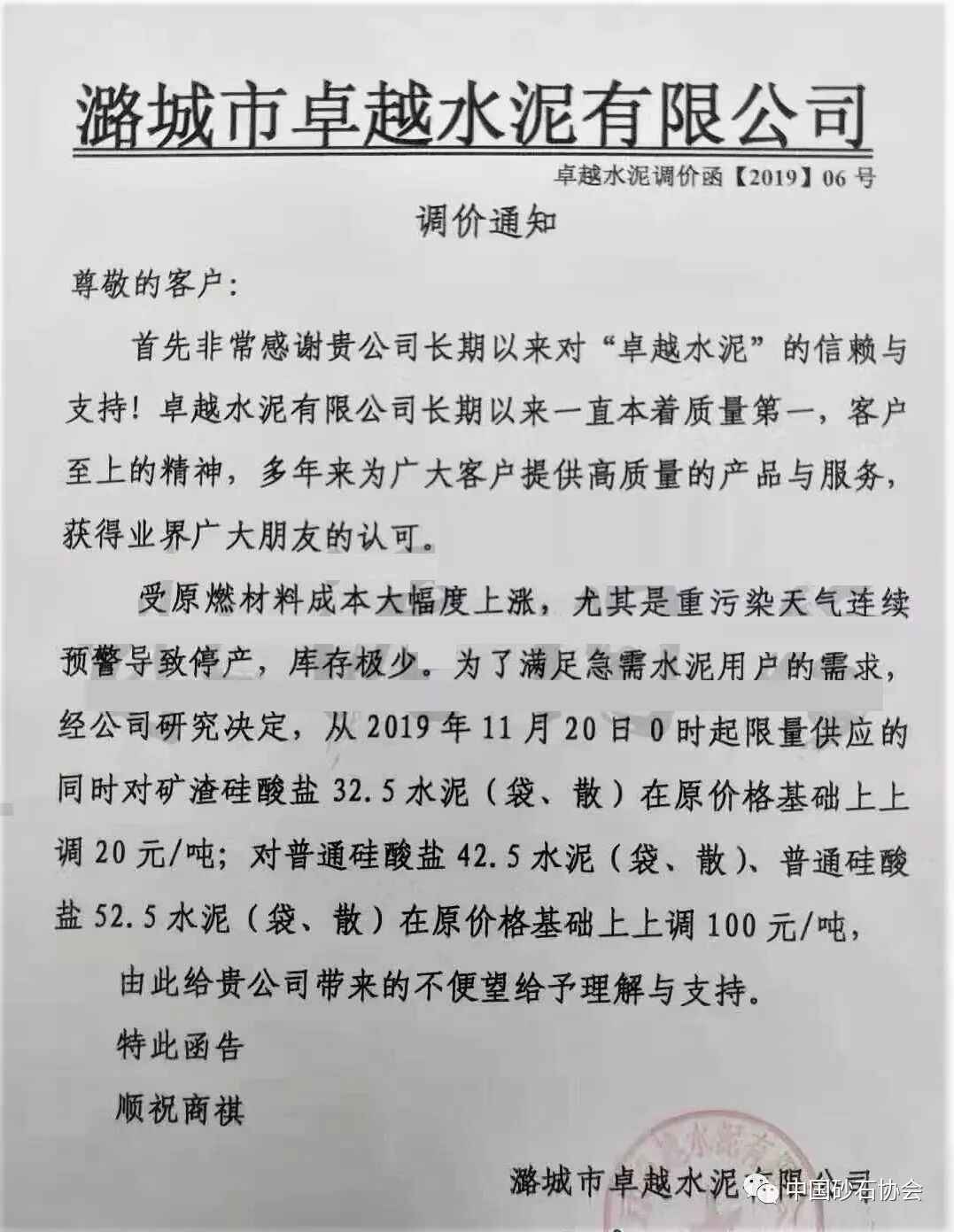 据悉,受原燃材料成本大幅度上涨,尤其是重污染天气连续预警导致停产,库存极少。山西某水泥有限公司发布调价通知称,为了满足急需水泥用户的需求,经公司研究决定:从11月20日0时起限量供应的同时对矿渣硅酸盐32.5水泥(袋、散)在原价格基础上上调20元/吨;对普通硅酸盐42.5水泥(袋、散)、普通硅酸盐52.5水泥(袋、散)在原价格基础上上调100元/吨。