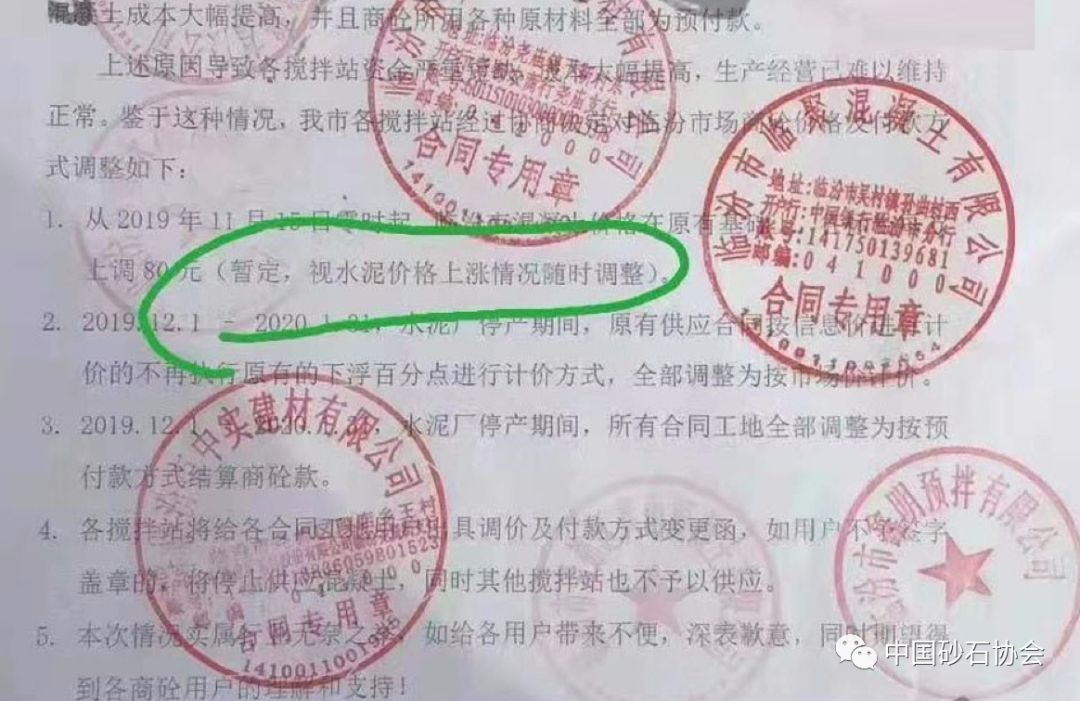 日前,山西临汾市商砼协会发函称,近一时期水泥厂已经开始错峰生产,并且根据环保需求从12月1日至2020年1月有31日临汾市水泥厂全部停产,这种情况将会造成临汾市场水泥严重短缺并且价格大幅上涨,连续几次累计涨价近100元/吨。协会宣布,2019年11月15日零时起,混凝土价格在原基础上上调80元/吨。