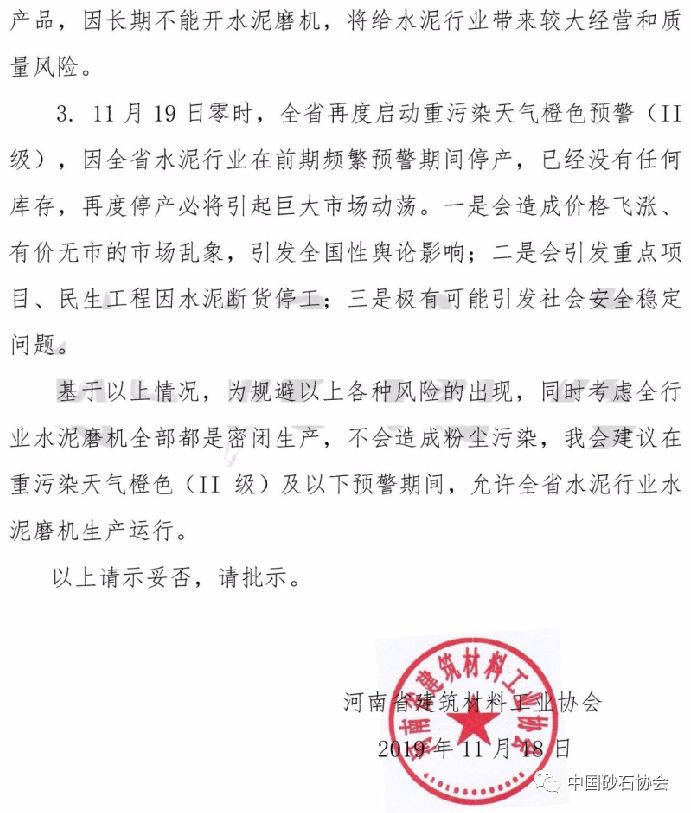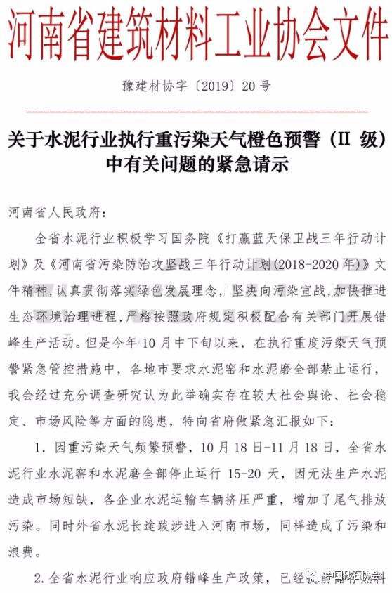 日前,河南省建筑材料工业协会上书河南省人民政府,建议在重污染天气橙色(II 级)及以下预警期间,允许全省水泥行业水泥磨机生产运行。全文如下: